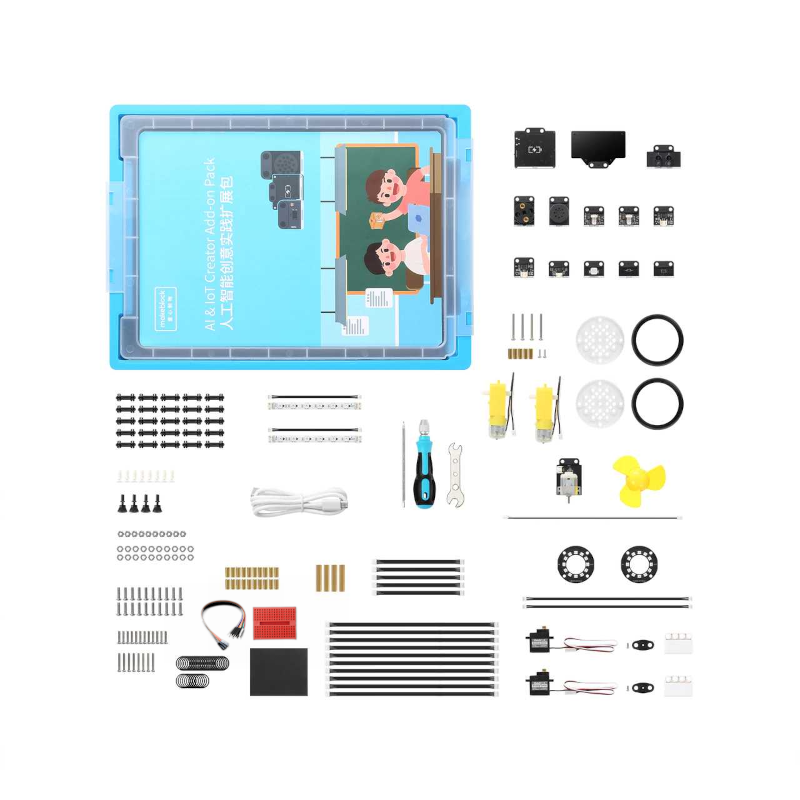 AI&IoT Creator Add-on Pack zawiera 13 dodatkowych czujników i modułów z płytką stykową prototypową i zestawem przewodów. Możesz go wykorzystać do zaawansowanych eksperymentów w klasie bądź na zajęciach dodatkowych. Czujniki i moduły są kompatybilne z robotem mBot2.