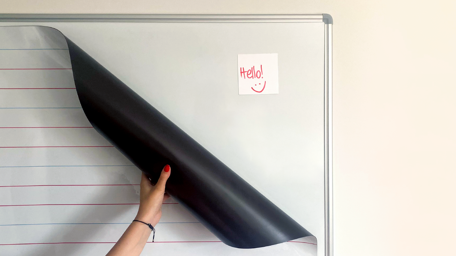 Nakładka przylega do wszelkiego rodzaju tablic szkolnych i flipchartów wykonanych na bazie blach. Uwaga: nakładka nie będzie przyczepiać się do tablicy szklanej!