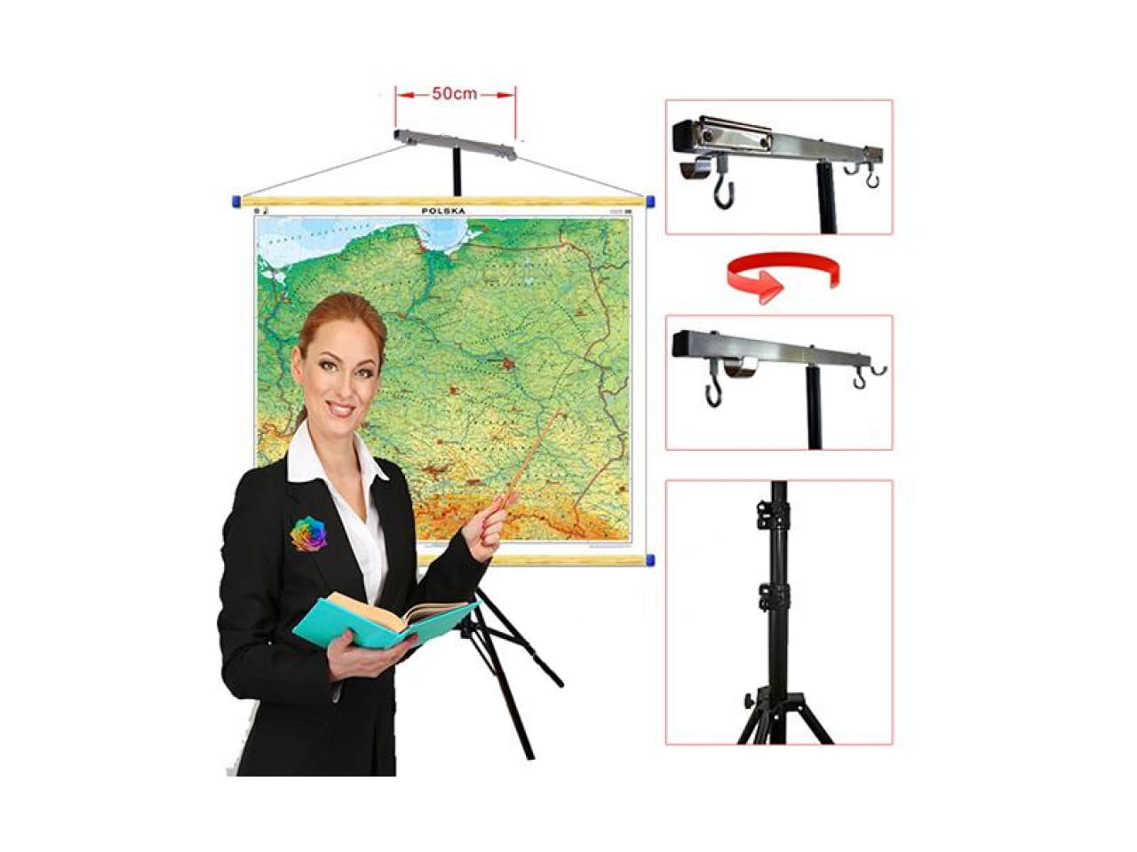 Na tym stojaku, po obydwu stronach belki zawieszającej, zaprezentujesz wszystko poczynając od zwykłej kartki papieru z zeszytu a na wielkoformatowej mapie kończąc...nawet jeśli ta ostatnia będzie miała urwaną linką zawieszającą !
