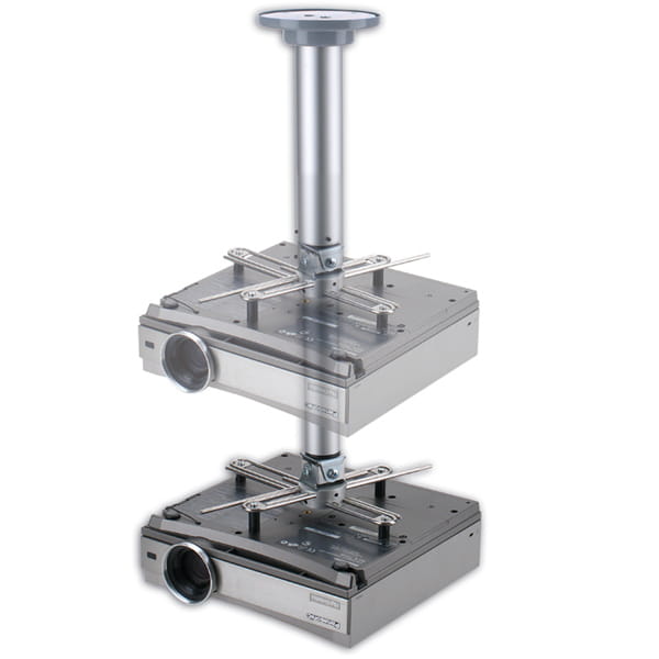 Uniwersalny uchwyt do mocowania sufitowego projektorów posiadających 3 lub 4 gniazda śrub mocujących od spodu projektora. Dla projektorów o wadze nie przekraczającej 12 kg. Regulacja urządzenia w 3 płaszczyznach. Estetyczne wykonanie. Pokrywa zasłaniająca otwór w suficie podwieszonym lub śruby stopy mocującej. Możliwość przeprowadzenia okablowania wewnątrz wysięgnika. Wysięgnik wykonany z rury aluminiowej. Długość: 100-120cm.