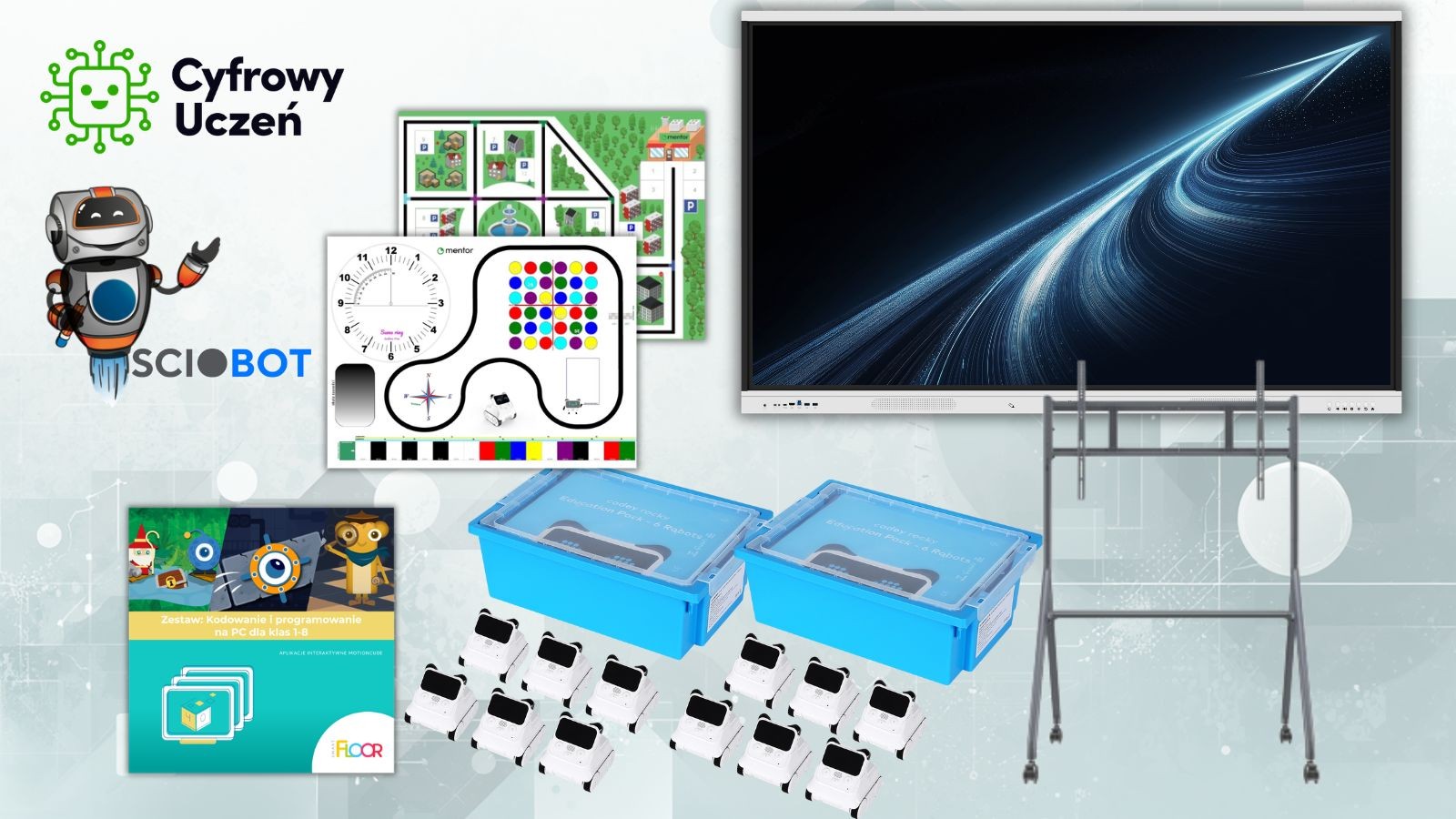 Uzupełnieniem zestawu jest oprogramowanie Kodowanie i programowanie na PC dla klas 1-8 (24 stanowiska), które umożliwia prowadzenie zajęć informatycznych i rozwijanie umiejętności programistycznych w środowisku komputerowym. Dzięki temu zestaw łączy naukę kodowania bez ekranów z pracą na komputerach, zapewniając kompleksowe podejście do edukacji cyfrowej.
