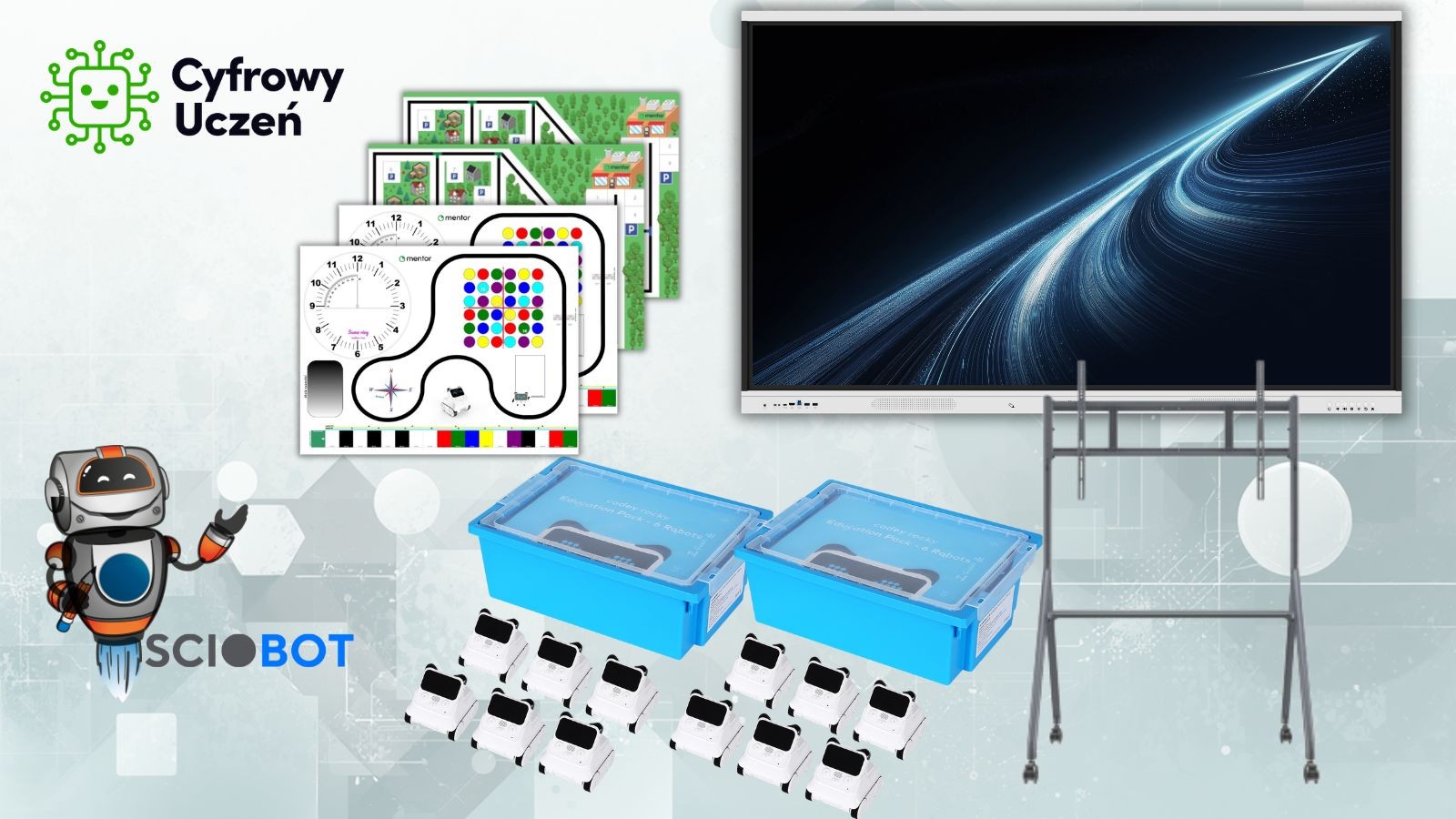 Zestaw zawiera również dwustronne maty edukacyjne STEAM oraz Miasto z kratką, które umożliwiają realizację zadań związanych z planowaniem tras, symulacjami oraz pracą projektową. Maty wspierają naukę poprzez działanie i pozwalają na prowadzenie zajęć w formie warsztatowej.
