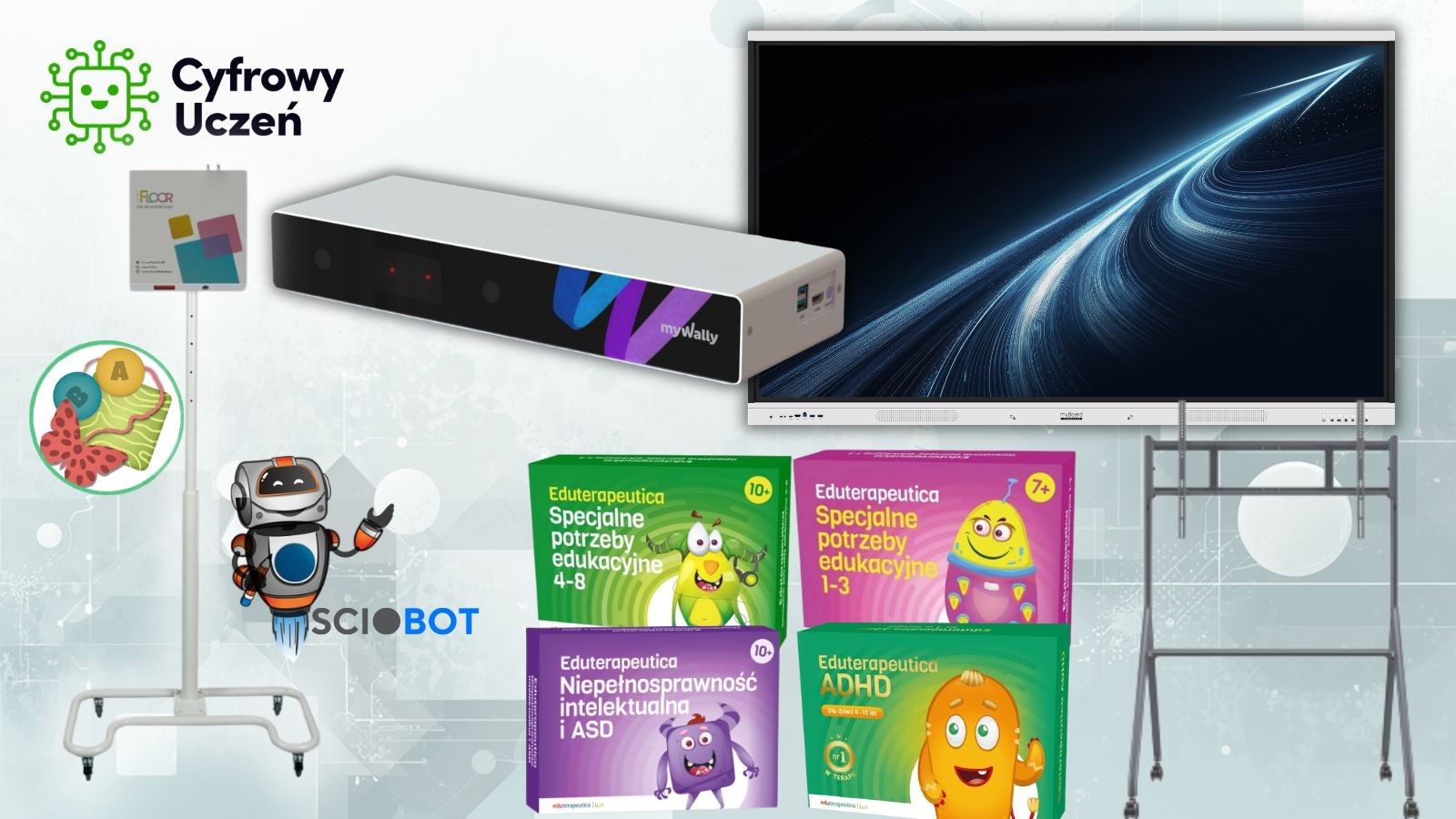 Zestaw zawiera również jednostkę centralną myWally wraz z oprogramowaniem edukacyjno-rewalidacyjnym (dla klas 1-3 lub 4-6), która wprowadza do zajęć element ruchu i interakcji. Dzięki temu uczniowie uczą się poprzez działanie, co zwiększa ich zaangażowanie oraz wspiera rozwój koncentracji, koordynacji i kompetencji społecznych.