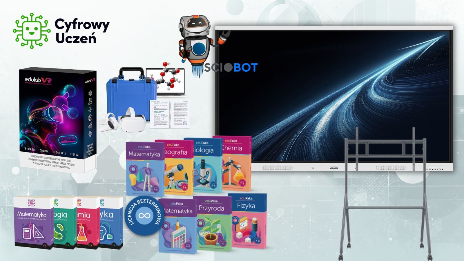 Zestaw został rozszerzony o bogaty pakiet materiałów dydaktycznych eduPaka oraz Multimedialne Pracownie Przedmiotowe, które umożliwiają prowadzenie zajęć zgodnych z podstawą programową w sposób nowoczesny i angażujący. Materiały te wspierają nauczyciela w realizacji lekcji z matematyki oraz przedmiotów przyrodniczych na różnych etapach edukacyjnych.
